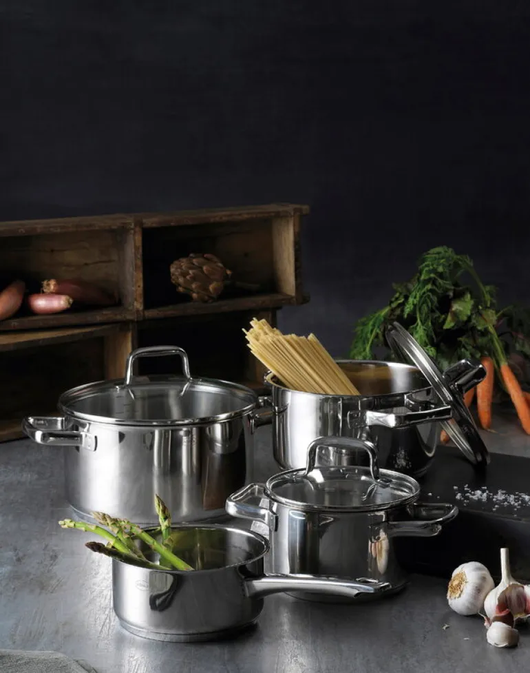 Rösles kokkärlsset Moments är en dröm som gått i uppfyllelse för alla hemmakockar. Det sofistikerade sju-delarssetet innehåller en 1,5-liters kastrull, en 2-liters gryta, en 3,6-liters gryta, en 5,8-liters gryta och tre genomskinliga lock som låter dig hålla koll på maten utan att ta av locket. De mångsidiga grytorna är tillverkade i rostfritt stål av hög kvalitet och passar i ugnen och på alla typer av spishällar, inklusive gas och induktion.
