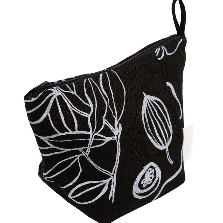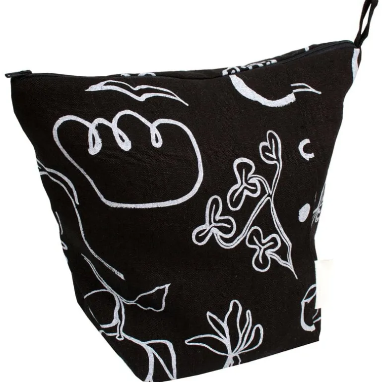 Onnenmaa-sminkväskan från Saana ja Olli kännetecknas av ett organiskt mönster format av mänskliga figurer, växter och andra naturelement. Onnenmaa (”Arkadien”) är målat med lösa penseldrag och avbildar ett drömlikt tryggt utrymme i en ostabil värld. Alla Saana ja Olli-produkter är tillverkade av slitstark 100 % hampa och de passar vardagslivet. Produkterna är transparent tillverkade i Finland.