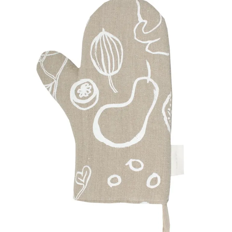 Onnenmaa-ugnshandsken från Saana ja Olli kännetecknas av ett organiskt mönster format av mänskliga figurer, växter och andra naturelement. Onnenmaa (”Arkadien”) är målat med lösa penseldrag och avbildar ett drömlikt tryggt utrymme i en ostabil värld. Alla Saana ja Olli-produkter är tillverkade av slitstark 100 % hampa och de passar vardagslivet. Produkterna är transparent tillverkade i Finland.