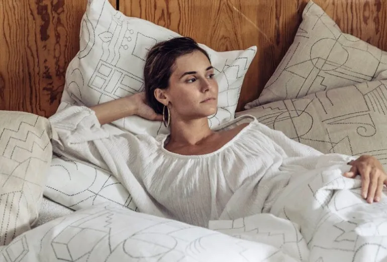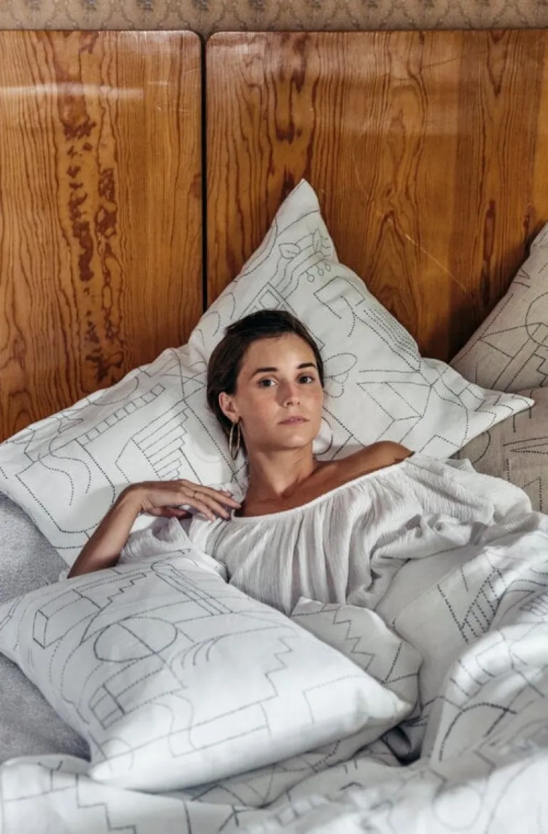 Kuddfodralet Unien talo från Saana ja Olli inspirerades av arkitektoniska drömmar och gamla finska husbyggnadstraditioner. Unien talo (”Drömhuset”) har abstrakta mönster skissade i klara, subtila linjer.