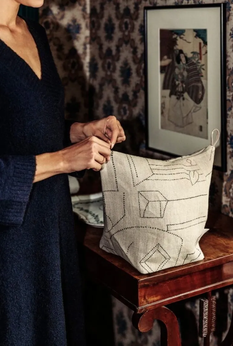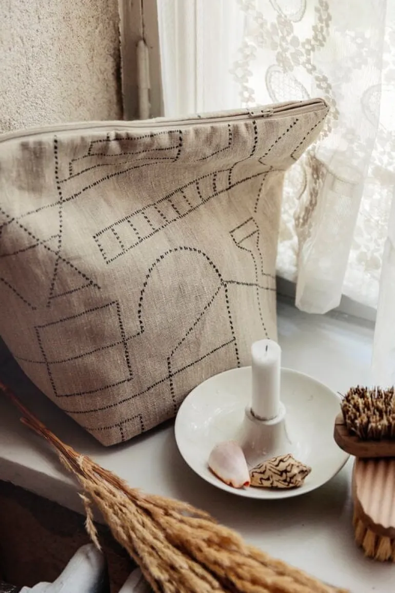 Unien talo-sminkväskan av Saana ja Olli är inspirerad av arkitektoniska drömmar och finsk hustradition. Unien talo (”drömmarnas hus”) kännetecknas av abstrakta mönster som målats i tydliga, subtila linjer. Alla Saana ja Olli-produkter är tillverkade av slitstark 100 % hampa och de passar vardagslivet. Produkterna är transparent tillverkade i Finland.