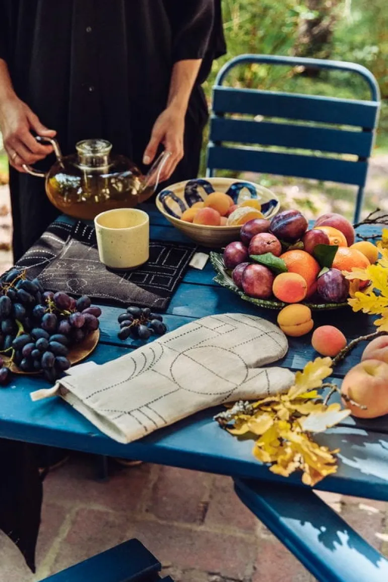 Unien talo-ugnshandsken av Saana ja Olli är inspirerad av arkitektoniska drömmar och finsk hustradition. Unien talo (”drömmarnas hus”) kännetecknas av abstrakta mönster som målats i tydliga, subtila linjer. Alla Saana ja Olli-produkter är tillverkade av slitstark 100 % hampa och de passar vardagslivet. Produkterna är transparent tillverkade i Finland.