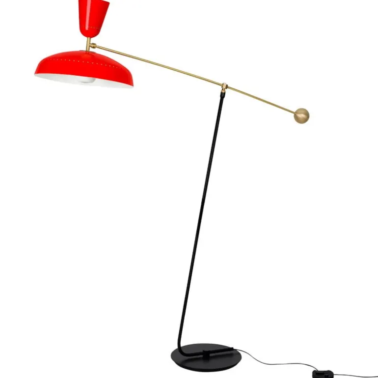 Golvlampan G1, från Sammode, utvecklades utifrån Pierre Guariches tidlösa design från 1951. Armaturen står på ett slankt ben och består av en lampskärm i metall med en elegant finish, samt en mässingstång som balanseras med en boll. Tillsammans skapar de ett modernt blickfång i vardagsrummet eller läshörnan. De två ljuskällorna lyser upp både direkt och indirekt, och med mässingstången riktar du enkelt ljuset i önskad riktning. Den dimbara golvlampan G1 tillverkas i Châtillon-sur-Saône, Frankrike.