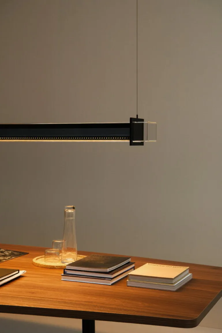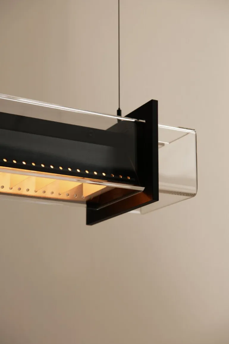 Pendellampan Quadratube från Sammode är Jean-Michel Wilmottes vinklade tolkning av den klassiska tublampan. Quadratube P2 hänger i smala kablar och lyser upp rummet med ett bländfritt nedåtriktat ljus som mjukas upp av metalljalusier som sitter framför ljuskällan. Lampan ger även ett dekorativt sidoljus som filtreras genom de små perforeringarna i metallhöljet. Pendellampan avger en industriell känsla med en touch av lyx och passar perfekt över bardisken, kontorsbordet, matbordet eller i hallen. Ljuset kan även dimras via Bluetooth med appen Casambi.