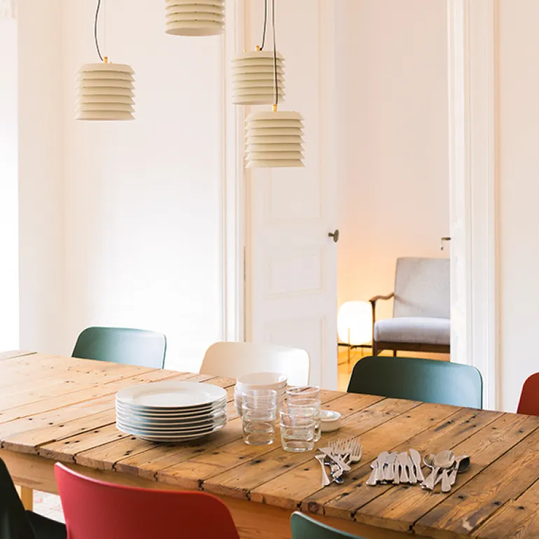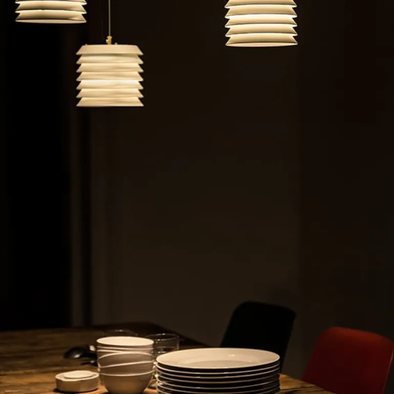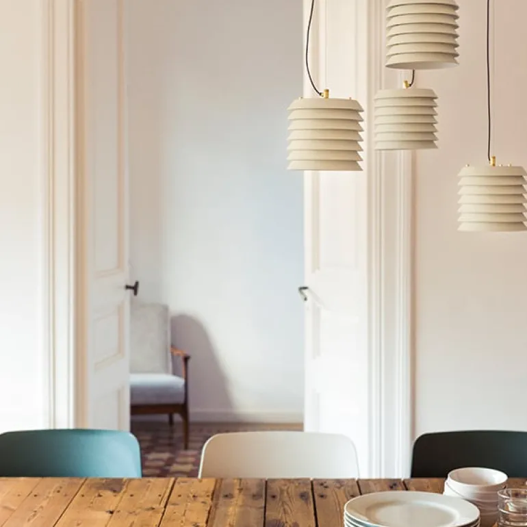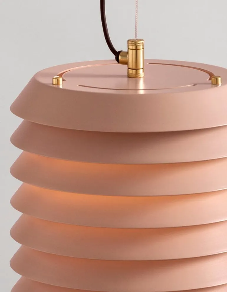 Santa & Cole har lanserat en nyutgåva av de tidlösa Maija Mehiläinen-lamporna, designade av Ilmari Tapiovaara 1955. Den finska formgivaren hämtade inspiration till bords-, pendel- och golvlamporna från Waldemar Bonsels barnbok Biet Majas äventyr (Maija Mehiläinen på finska), vilket tydligt framgår av den distinkta, bikupeliknande formen. Lamporna, som består av metallskivor staplade ovanpå varandra, filtrerar ljuset på ett vackert sätt och skapar en behaglig atmosfär. Maija-lamporna ingår i det spanska märkets Design Classics kollektion och finns i vitt och i den ursprungliga färgtonen nude rose.