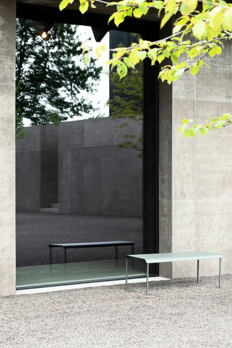 August-bänken från Serax är tillverkad av pulverlackerat aluminium och passar både för inomhus- och utomhusbruk. Metallbänken trivs lika bra ute i trädgården eller på uteplatsen som den gör bredvid ett matbord inomhus.