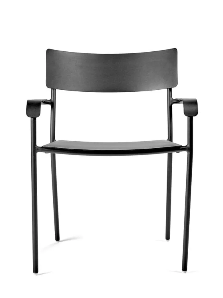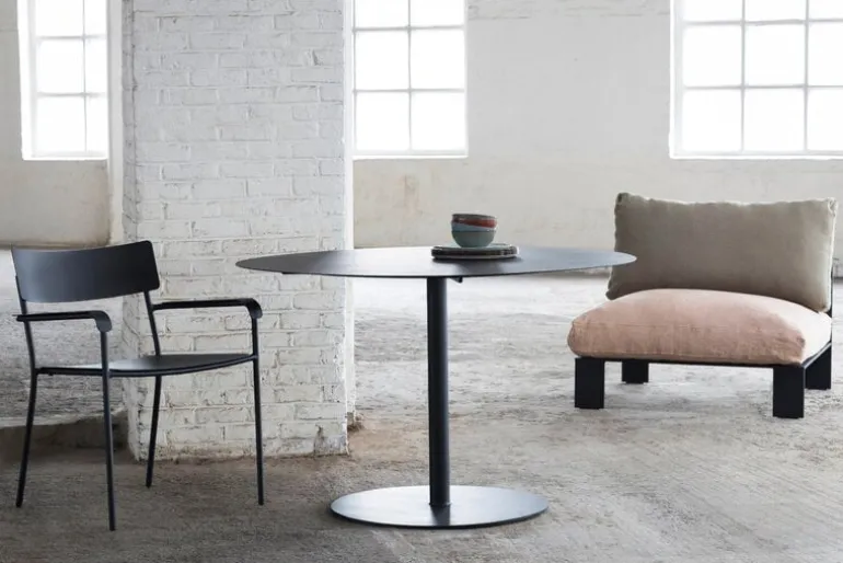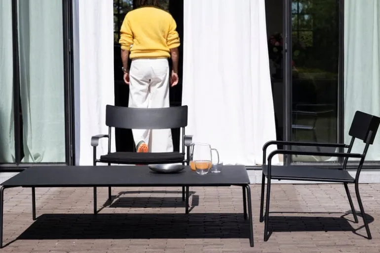 Karmstolen August, från Serax, är tillverkad av pulverlackerad aluminium och är lämplig för både inomhus- och utomhusbruk. Den bredare, relativt låga karmstolen passar lika väl i trädgården eller på uteplatsen som vid ett matbord eller skrivbord inomhus.