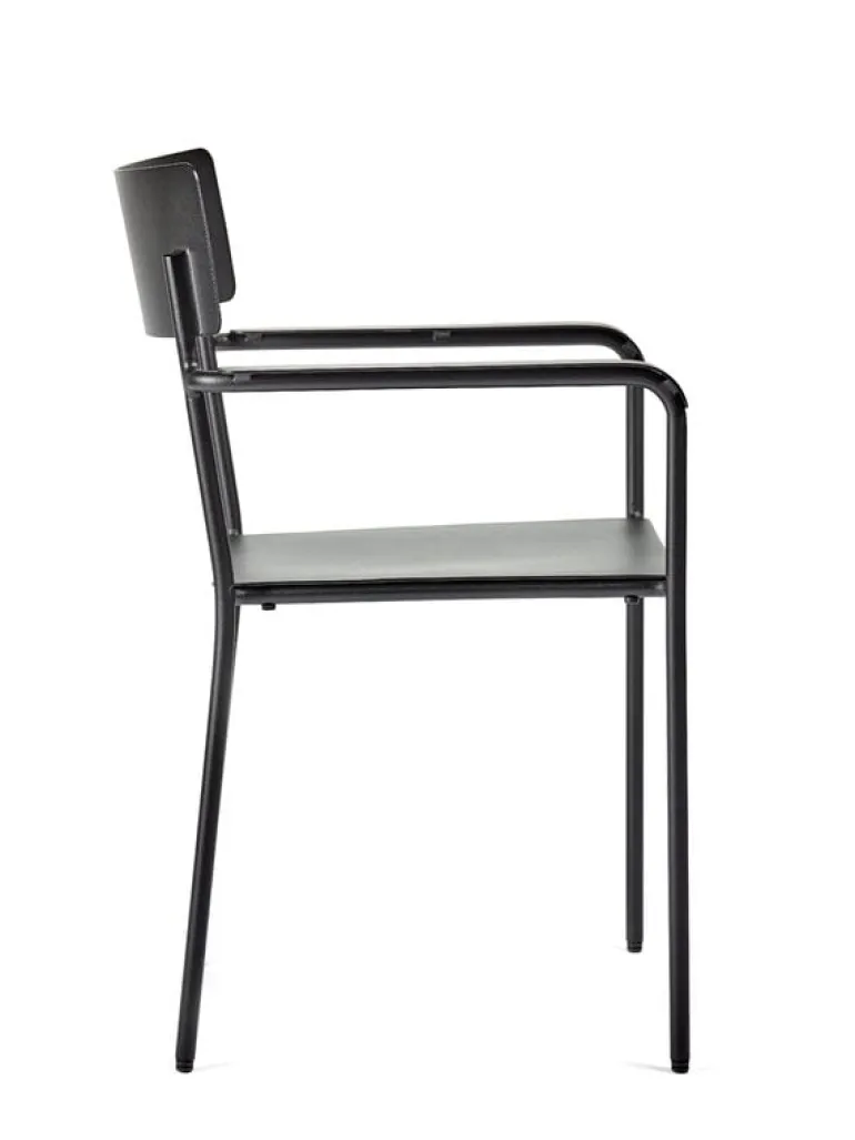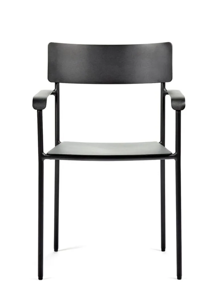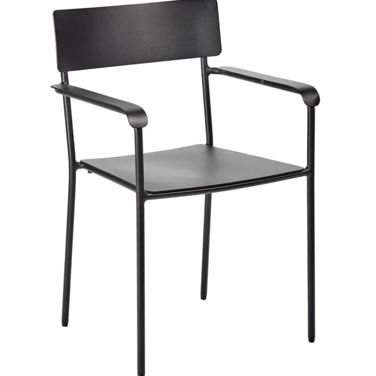 Karmstolen August, från Serax, är tillverkad av pulverlackerad aluminium och är lämplig för både inomhus- och utomhusbruk. Den kompakta, relativt höga karmstolen passar lika väl i trädgården eller på uteplatsen som vid ett matbord eller skrivbord inomhus.