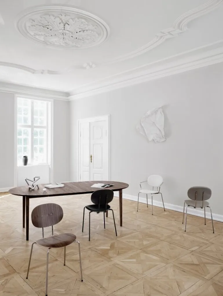 Sätesmaterialet i Piet Hein-stolen är böjt träfaner och de dynamiskt positionerade, lätt lutande benen är gjorda av stål. Tack vare den stapelbara ramen och den smidiga, men ändå robusta, designen passar Piet Hein-stolarna lika väl i hemmet som på restauranger.