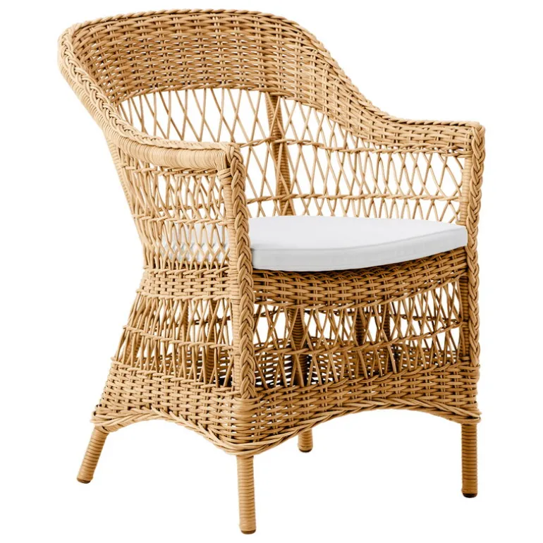 Sika-Designs Charlot stol är en utomhus matstol med en hög ryggstöd och en enkel, luftig vävning gjord av syntetisk rotting. Sitsdynorna är designade för utomhusbruk och har avtagbara, maskintvättbara överdrag.