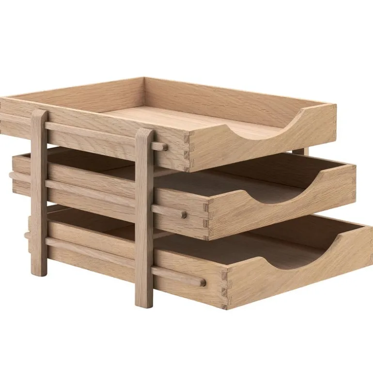 Brevkorgen Dania från Skagerak håller dina brev, räkningar och andra viktiga papper på plats och i bra ordning. Brevkorgen består av tre avtagbara lådor i olika nivåer. Deras utseende fulländas med det rundade snittet framtill och hörnens vackra detaljer. Brevkorgens obehandlade ekyta tillför en klassisk, organisk touch till ditt skrivbord.
