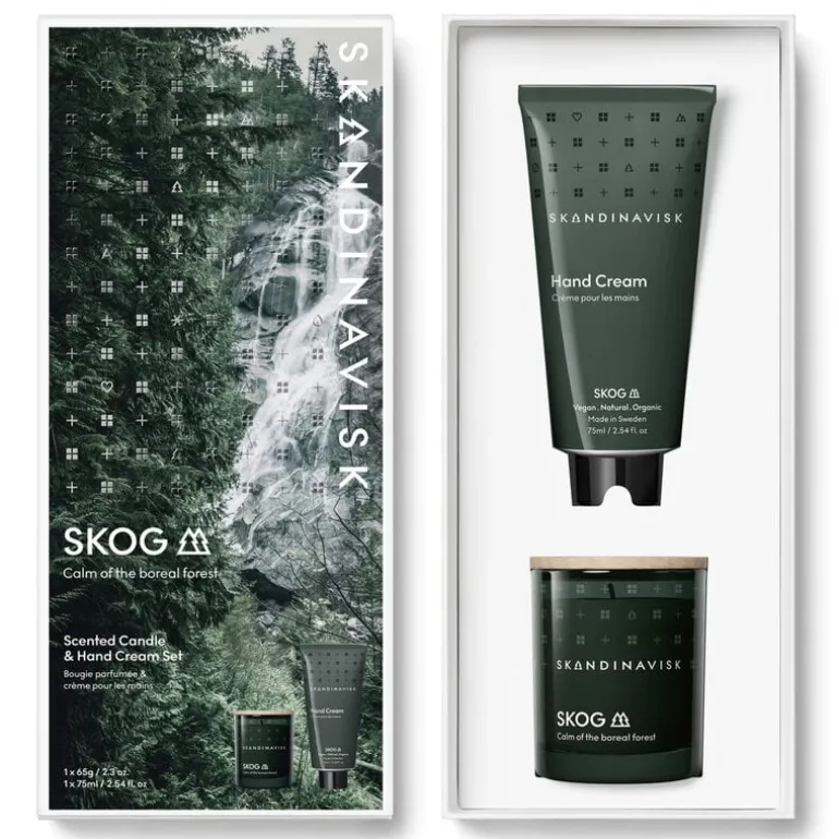 Skandinavisks presentset Skog innehåller en handkräm och ett litet doftljus, vackert förpackade i en presentask. Skog, som betyder ”skog” på svenska, har en skogsdoft av tallbarr och grankottar, med subtila inslag av björksav och liljekonvalj.