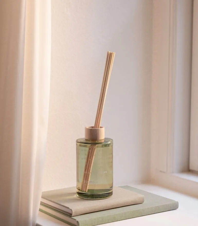 Skandinavisks doftspridare fyller ditt hem med en sofistikerad nordisk doft. Antalet rottingpinnar avgör styrkan på doften – placera en pinne i flaskan om du vill ha en diskret doft, eller flera om du vill njuta av den unika doften till fullo. Den vackra glasflaskan är smyckad med en ring i bokträ, och den kan antingen användas som ett stilrent prydnadsföremål eller som en liten vas till vilda blommor. Den ofarliga, alkoholfria doften är framställd av förnybart producerade vegetabiliska oljor. Doften varar i ungefär tre månader, och tack vare refillförpackningarna som säljs separat kan flaskan fyllas på otaliga gånger.