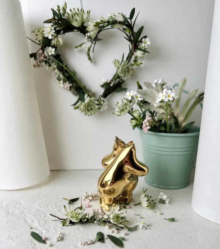 Skultunas figur Mumintrollet & Snorkfröken är en del av Moomin x Skultuna-kollektionen. Tove Janssons mest älskade Mumin-karaktärer har fått en elegant gyllene glöd: de små skulpturerna är gjorda av stål och belagda med äkta 18-karats guld. De högkvalitativa materialen och den lyxiga finishen gör figurerna tidlösa och hållbara – de tillför en dos av lekfull elegans till vardagen, både i barnrummet och i andra rum i hemmet. Ljusa upp ditt skrivbord med dina favoritkaraktärer eller dekorera din bokhylla med hela Muminfamiljen! De omfamnande karaktärerna gör också en utmärkt bröllops- eller förlovningsgåva eller en present till din egen betydande andra.