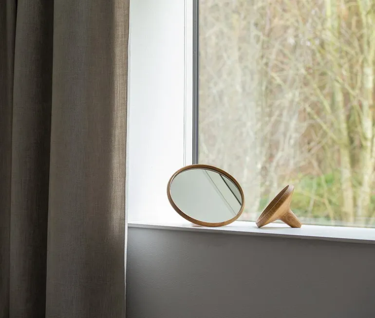 Spring Copenhagens Satellite är en snygg, rund handspegel som är inramad av naturellt ekträ. Det lilla handtaget fungerar även som ett ställ, så att du kan placera den på ett bord. Christoffer Skjøtt är formgivaren bakom designen, som även fått prydas av vackra träfogar.