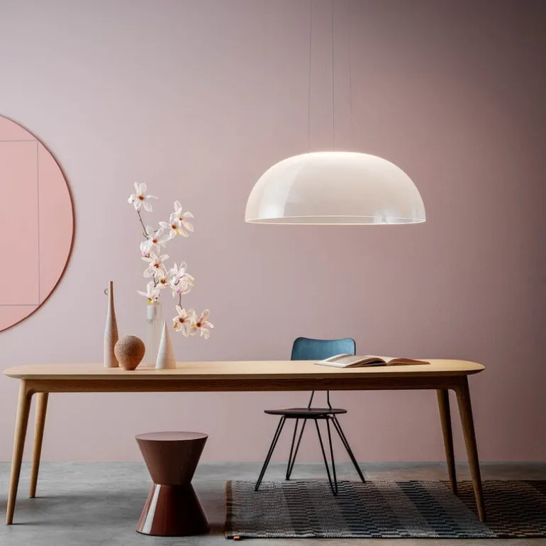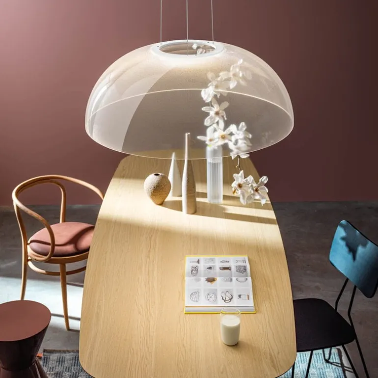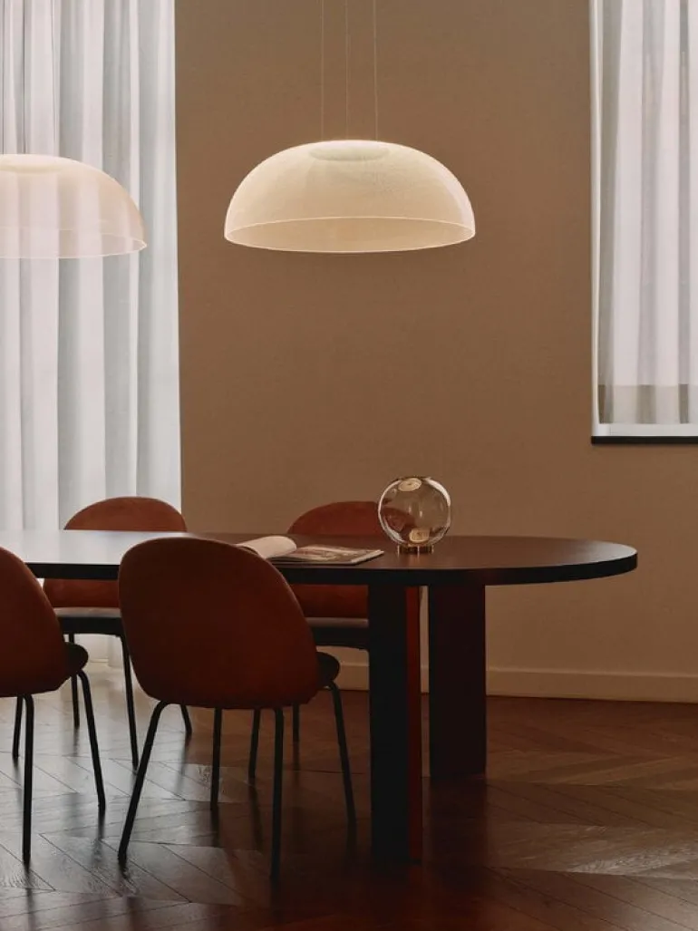 Stilnovos pendel Demi är full av överraskningar. När den är släckt ser lampans stora, kupolformade skärm nästan genomskinlig ut, men när den tänds avslöjar den sina hemligheter. Lampan använder innovativ teknik med tusentals lasergraverade mikromönster som skapar ett mjukt, atmosfäriskt sken. Ljuskällan är diskret placerad i toppen av armaturen. Designern Mirco Crosatto hämtade inspiration till pendellampan Demi från det ikoniska Pantheon i Rom, där det cirkulära takfönstret badar rummet i ljus på samma sätt som Demi-pendellampan gör.