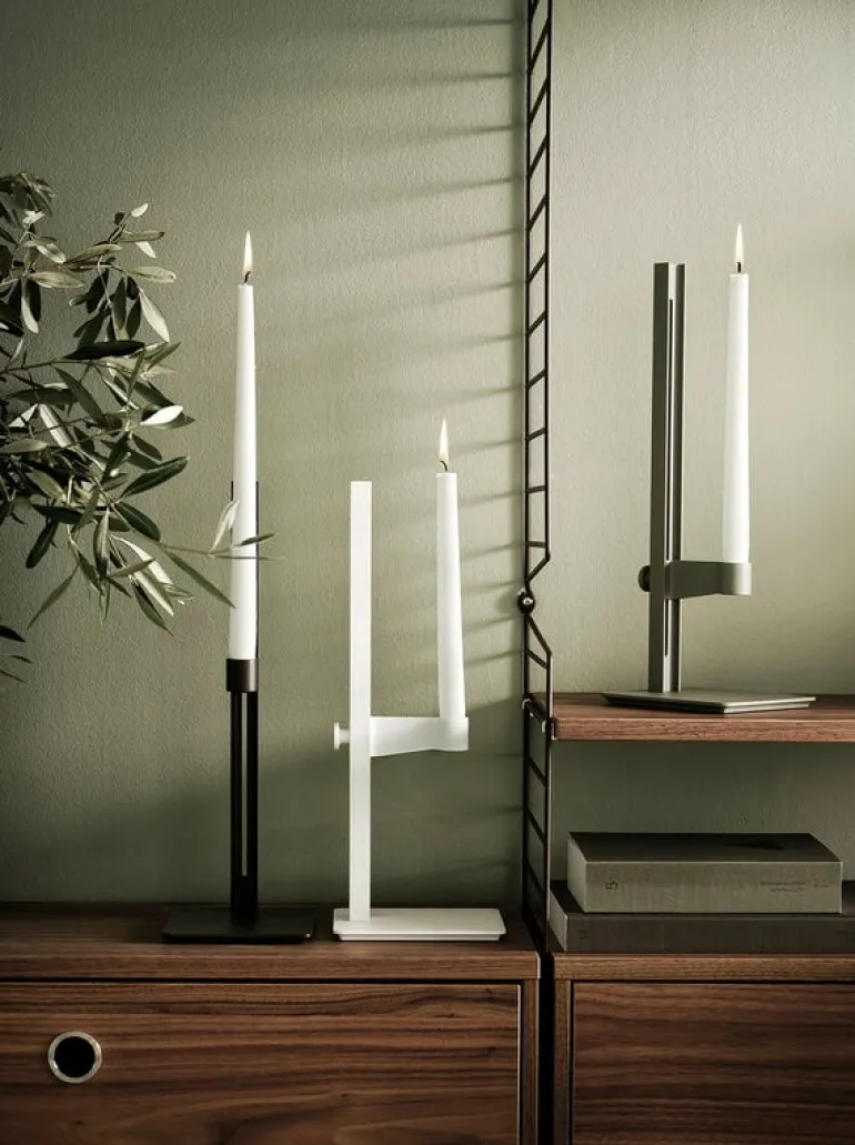 Museum ljusstake från String Furniture är en elegant inredningsdetalj som skapats i samarbete med arkitektur- och designstudion TAF. Inspirerad av industriella stålbalkar är ljusstaken höjdjusterbar, vilket möjliggör en mängd olika uttryck med en enda produkt: den högsta höjden för ljuset är 35,5 cm och den lägsta höjden är 3,5 cm. Tillverkad av aluminium finns Museum tillgänglig i flera färger.