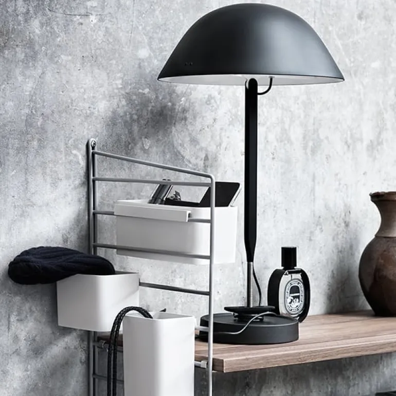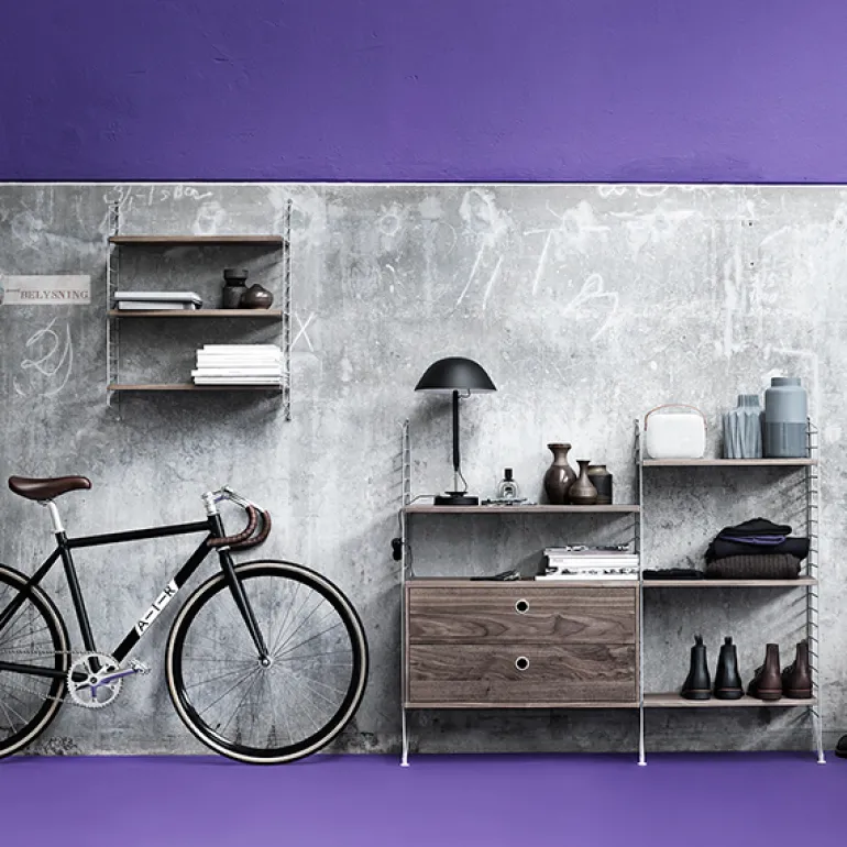 String System är ett mångsidigt, modulbaserat hyllsystem som den svenska arkitekten Nils Strinning skapade år 1949. De karakteristiska, stegliknande golv- och sidopanelerna kan kombineras med hyllor, tidningshyllor, skrivbord, klaffbord, byråer och skåp för att bygga ihop ett system som passar just dina behov. String Systems tidlösa och minimalistiska design passar perfekt i både moderna bostäder och kontor.