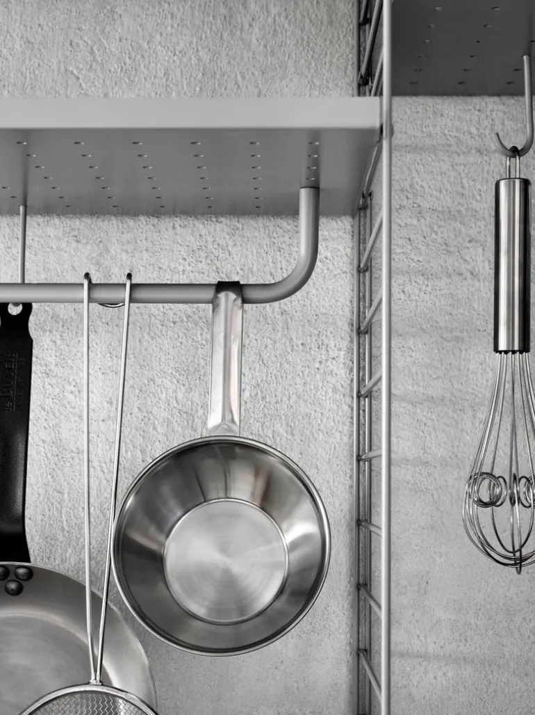String-krokarna fästs på String-metallhyllorna och är perfekta att hänga upp kläder och köksredskap på. En uppsättning med fem metallkrokar.