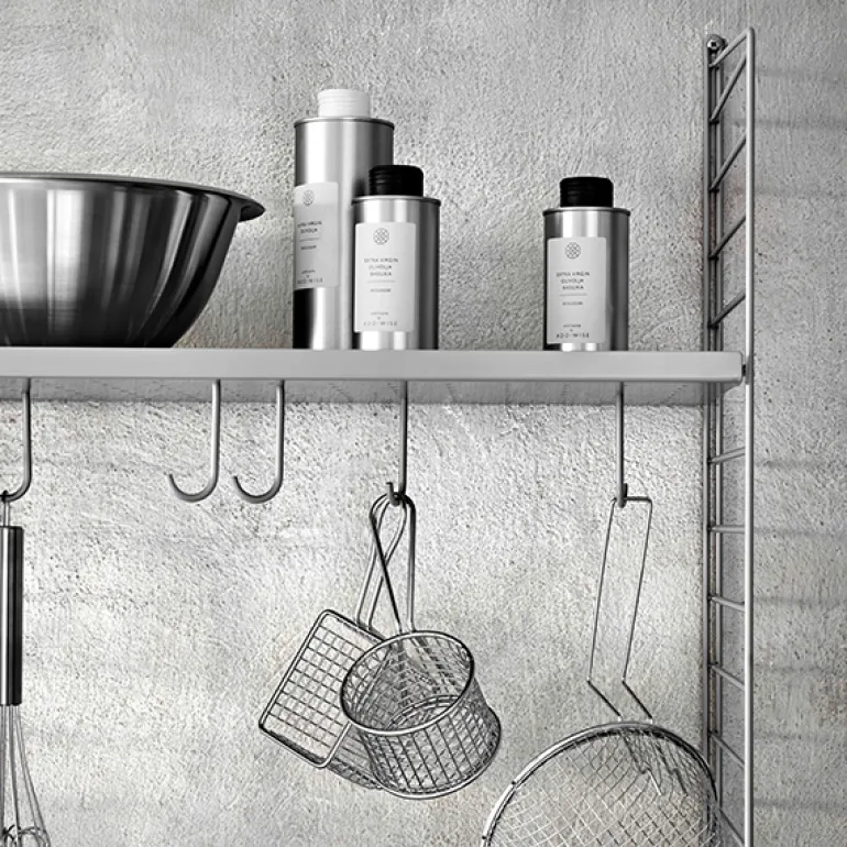 String-krokarna fästs på String-metallhyllorna och är perfekta att hänga upp kläder och köksredskap på. En uppsättning med fem metallkrokar.