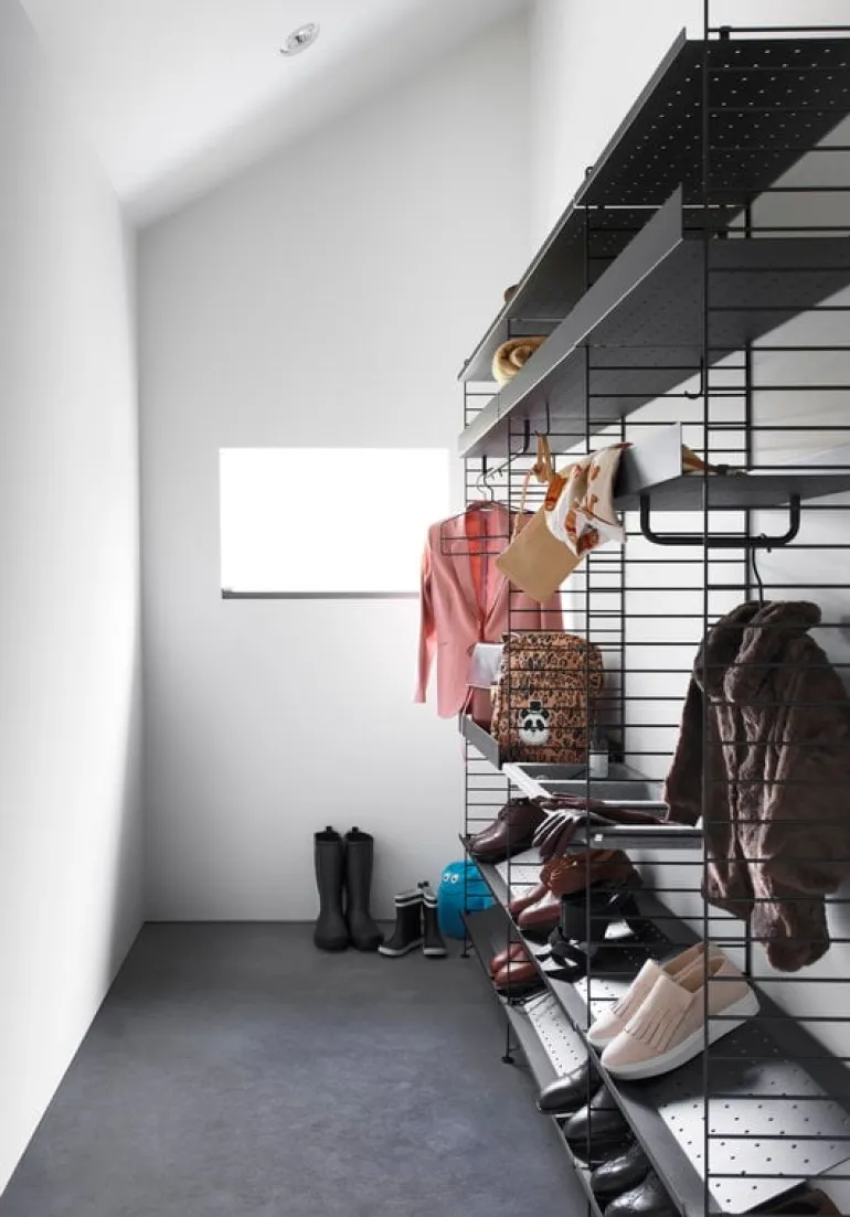 Den höga Stringhyllan i metall är gjord för att passa Stringpanelerna som mäter 30 cm i bredd. Uppgradera hyllan med String Systems smarta krokar och metallstänger för extra förvaring.