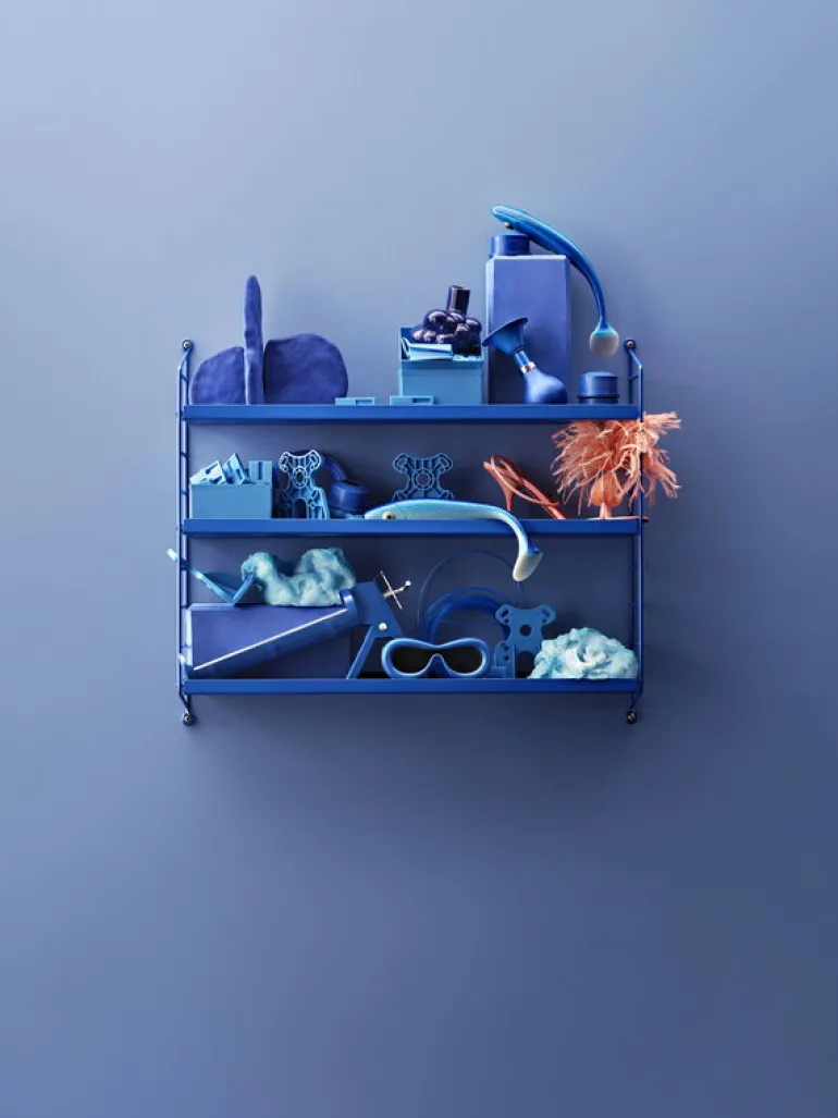 Metallhyllan String Pocket designades i samarbete med svenska formgivarna Anna von Schewen och Björn Dahlström. Metallhyllan passar särskilt bra i köket eller badrummet tack vare sina perforerade hyllor: du kan enkelt addera tillbehör som krokar till handdukar, grytlappar eller andra köksredskap. Hyllorna har tunna böjda kanter som hjälper att hålla innehållet säkert.