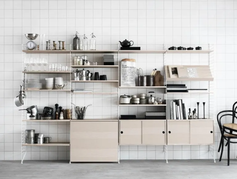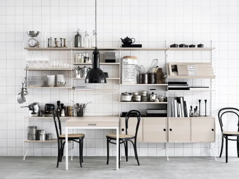 String System är ett flexibelt hyllsystem som den svenska arkitekten Nils Strinning skapade år 1949. De karakteristiska, stegliknande sidopanelerna kan kombineras med hyllor, tidningshyllor, skrivbord, klaffbord, byråer och skåp för att bygga ihop ett system som passar just dina behov. String Systems tidlösa och minimalistiska design passar perfekt i både moderna bostäder och kontor.