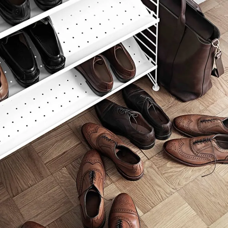 Strings skohylla i metall är särskilt framtagen för hallens och garderobens förvaringslösningar. Skohyllan kan kombineras med de 30 cm breda String-sidopanelerna.