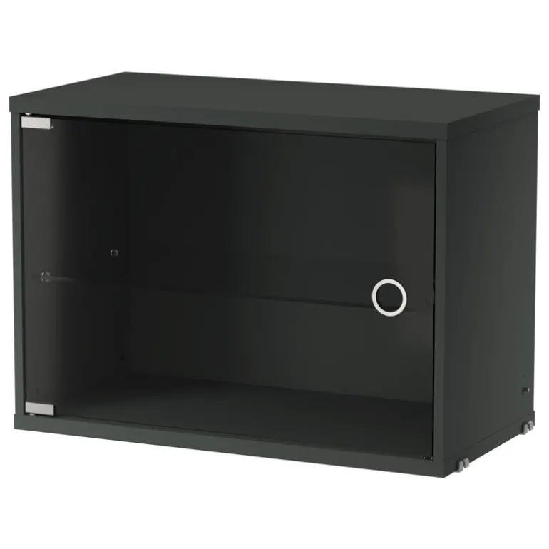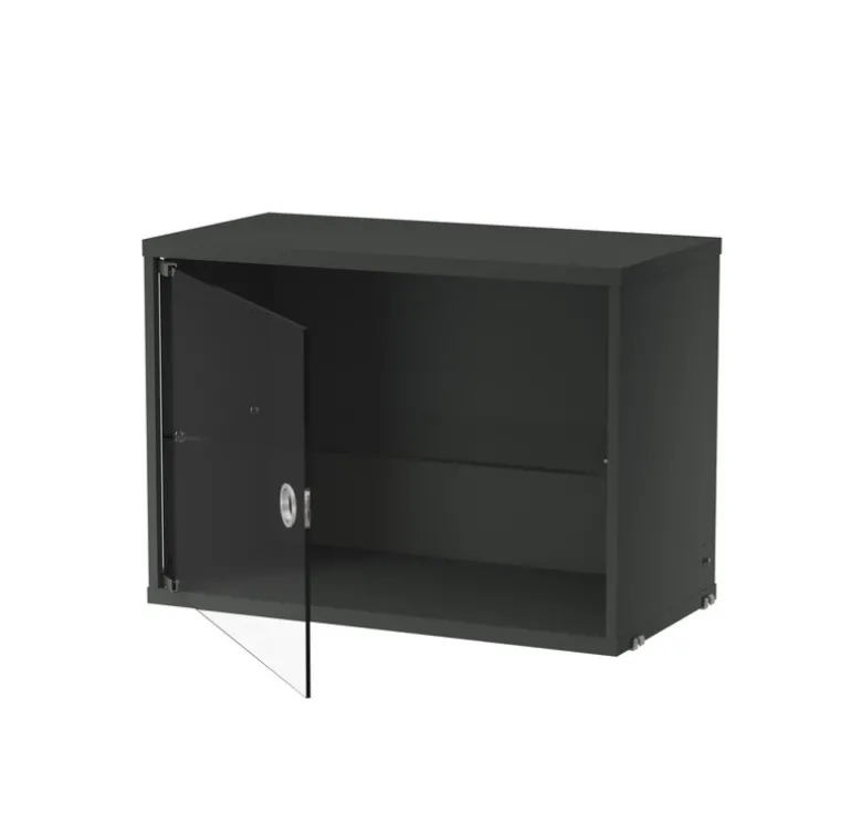 String vitrinskåp med svängdörr i glas kompletterar hyllsystemet String på ett elegant och praktiskt sätt. Till vitrinskåpet, som passar till alla 30 cm djupa String-paneler, medföljer en glasdörr med gångjärn och en justerbar hylla. Det här lilla glasvitrinskåpet kan du använda som vacker och dammfri förvaringsplats för dina vinglas och porslinstallrikar i köket, men du kan även ställa in prydnadsföremål och ha det i vardagsrummet.