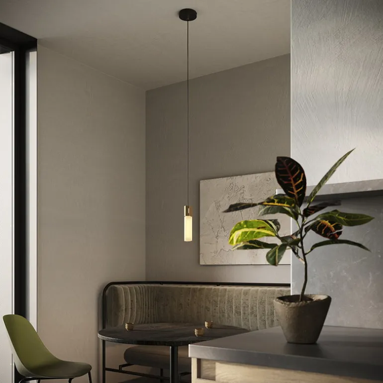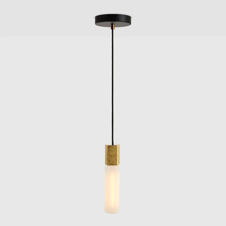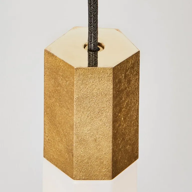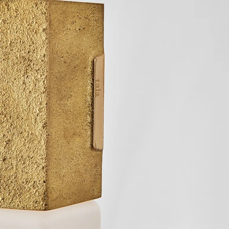 Basalt Single-lampan består av en oregelbundet hexagonal pendel, tillverkad av sandgjuten mässing, som kompletteras av en förlängd, liknande vinklad glödlampa vars frostat matta yta mjukar upp ljuset på ett skonsamt, behagligt sätt. Lampan är designad för att visa och understryka dess tillverkningsmetoder, och den sandgjutna, texturerade ytan har inte polerats på dess vertikala sidor. Dessutom täcks platsen där den smälta mässingen gick in i sandformen av en Tala-logotyp som en subtil nick till den använda gjuttekniken.