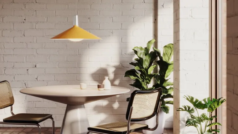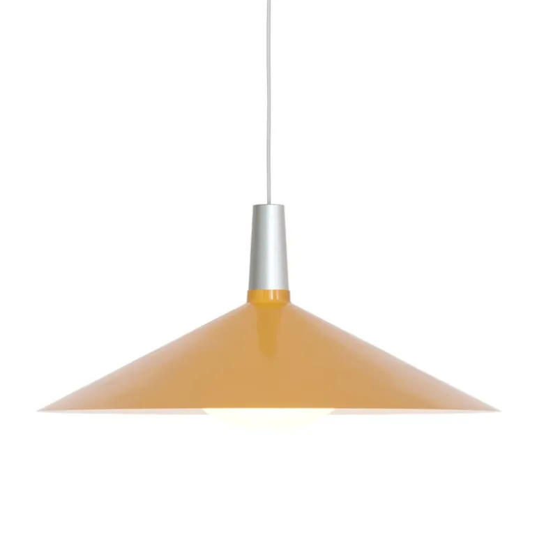 Pendellampan Bower från Tala kombinerar en matt aluminiumbas med en glänsande, konformad stålskärm som riktar ljuset nedåt. Den här designen gör lampan perfekt för att lysa upp matbordet eller soffbordet. Den geometriska looken kompletteras med Talas dimbara, mattvita LED-lampa, som har en stor, oval formad skärm av munblåst glas. Lampan kan även användas med andra lampor som har en standard E27-sockel.