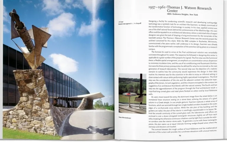 Saarinen, som publicerades av Taschen, täcker den finsk-amerikanske arkitekten och formgivaren Eero Saarinens (1910-1961) karriär. Saarinen blev känd för sin visionära stil som lekte med kontrasterna mellan starka silhuetter och modernistiskt ljus. Några av hans mest hyllade verk inkluderar Dulles internationella flygplats i Washington D.C., TWA-terminalen på JFK flygplats i New York, samt Gateway Arch i St. Louis. Boken, skriven av San Fransisco Bay-arkitekten Pierluigi Serraino, är en del av serien Basic Architecture från Taschen som presenterar internationellt erkända arkitekters liv och verk med ungefär 120 fotografier, skisser och utkast. Redaktör för samlingen är den tyske konsthistorikern Peter Gössel.