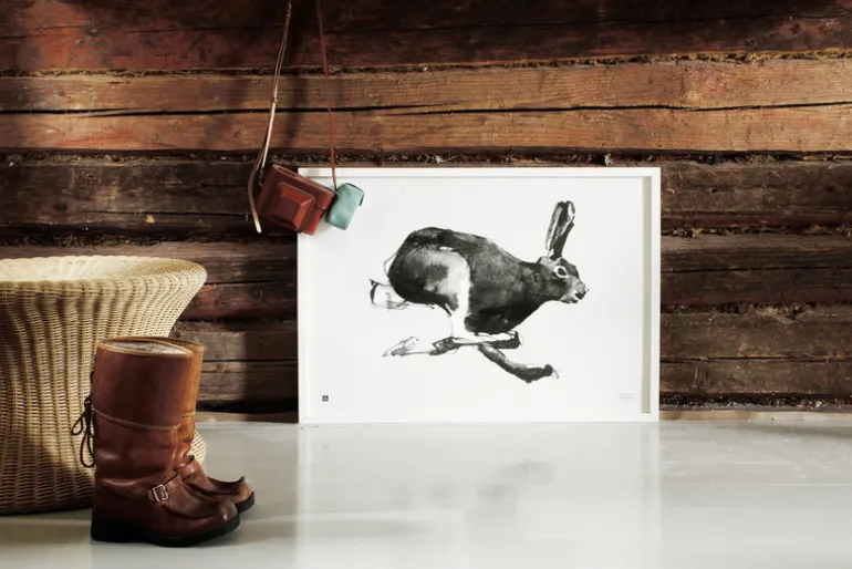 Teemu Järvis poster Hare ingår i posterserien Forest Greetings, som innefattar konstnärens slutsålda konsttryck. Postern är offsettryckt i Finland på 150 g obestruket naturvitt papper. Fullända posterns naturliga utseende med Teemu Järvis träram som säljs separat.