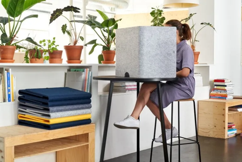 The Hide är en kollektion av skrivbordsskärmar tillverkade av ljudabsorberande och brandhämmande polyesterfiber, som produceras från återvunna plastflaskor. Skärmarna har behandlats med en antiviral och antimikrobiell finish och är icke-allergiframkallande och lätta att hålla rena. Skärmarna tillverkas i England av The Hide, ett företag som specialiserar sig på akustiska inredningslösningar.