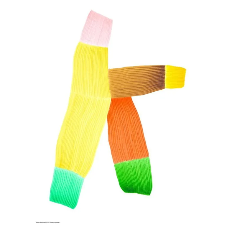 Drawing 2 är tryckt digitalt på Chromolux-behandlat papper. Med den här tekniken blir det färgade bläcket matt på papprets glansiga yta, vilket påminner om Bouroullecs verkliga teckningsteknik.
