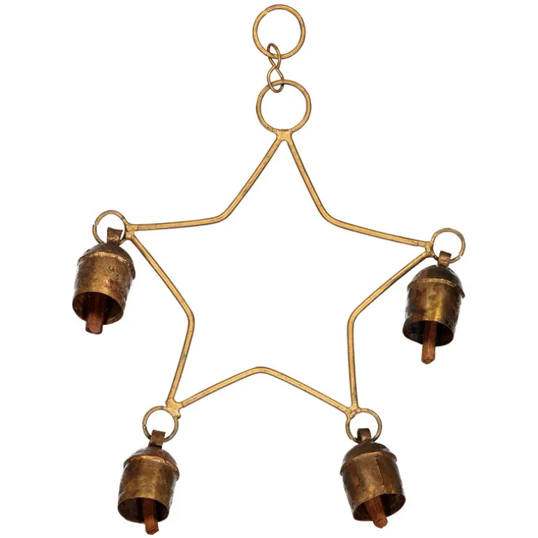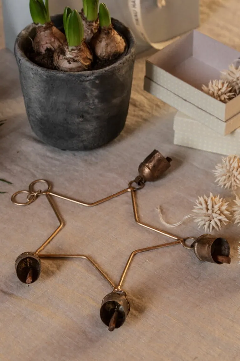 Tikaus stjärnformade klockdekoration Star Bell gör att stämningen i ditt hem blir både värmande och festlig. Dekorationen, som är gjord av mässing och trä, har fyra små klockor, vars mjuka toner för tankarna till klingande kobjällror. Häng den i fönstret eller på dörren, eller använd den som ett rogivande vindspel.