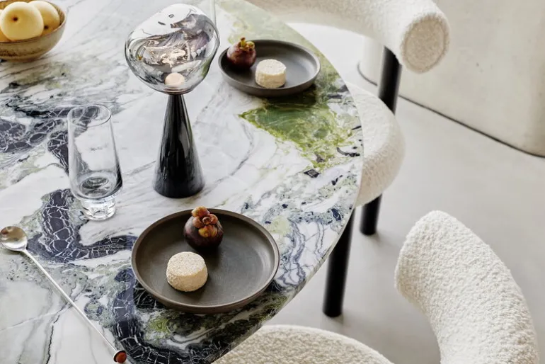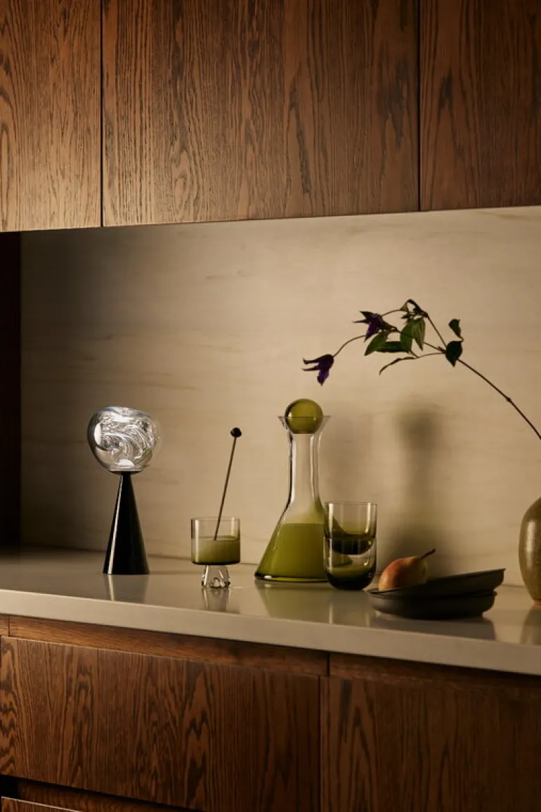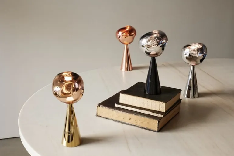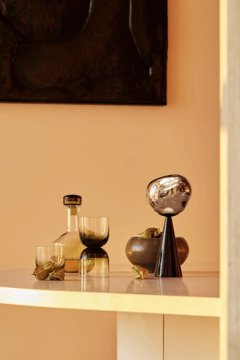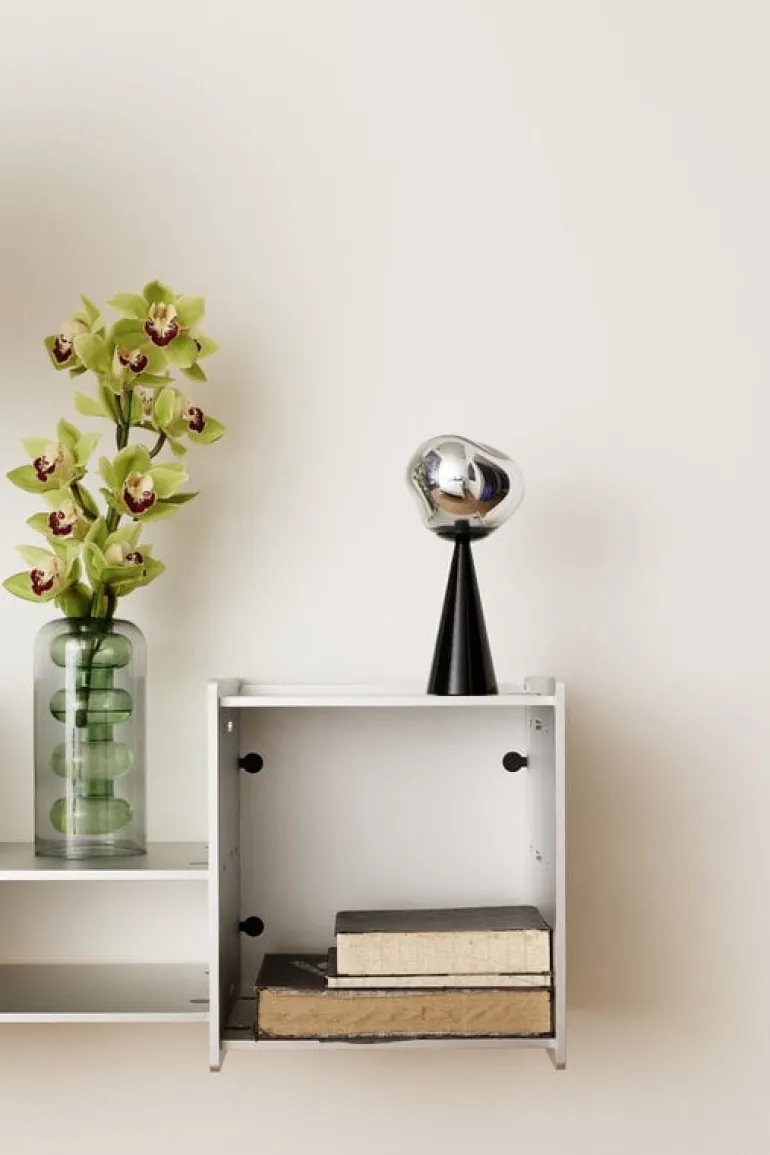 Tom Dixons fascinerande bordslampa Melt är formgiven i samarbete med det svenska designkollektivet Front. När Melt är släckt blir ytan glänsande och speglande, och oregelbundenheterna reflekterar ljuset på väldigt spännande sätt. Bara när den är tänd eller i fullt dagsljus blir lampan genomskinlig och skapar en illusion av varmt, smält glas.