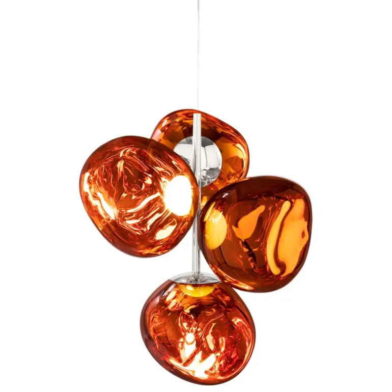 Pendellampan Melt Chandelier Mini, från Tom Dixon, har formgivits i samarbete med den svenska designkollektivet Front. När den är släckt har Melt en glänsande spegeleffekt och den ojämna ytan reflekterar ljuset på ett spännande sätt. Endast när den är tänd eller i fullt dagsljus blir pendeln genomskinlig och skapar en illusion av hett, smält glas. Melt Chandelier Mini består av fyra glasklot som tillsammans skapar en spektakulär tolkning av en modern ljuskrona.