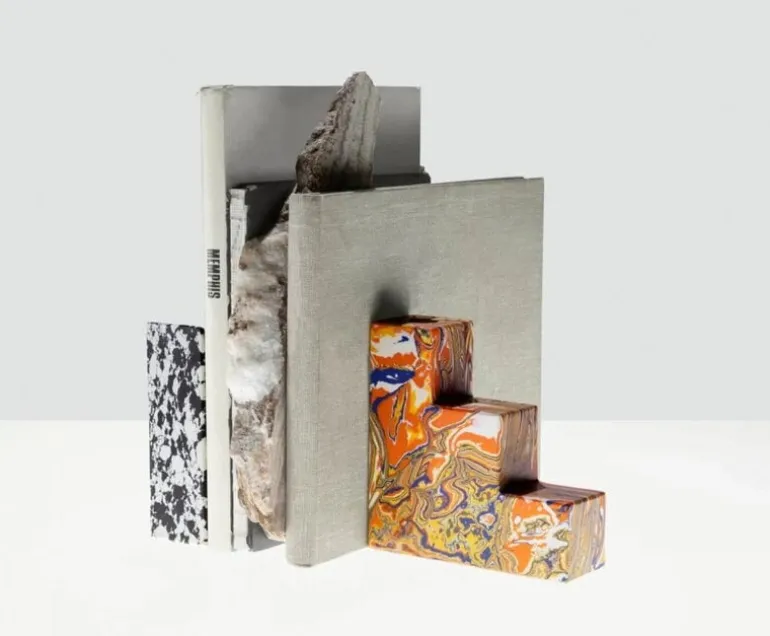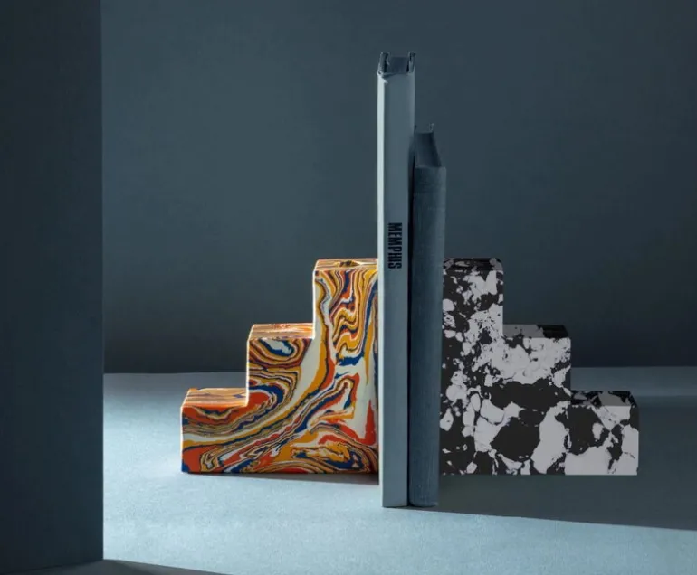 Precis som andra produkter från Tom Dixon Swirl består bokstödet av olika geometriska former staplade på varandra för att bilda tredimensionella skulpturer. Alla Swirl-produkter är tillverkade av avfallsmaterial från marmorindustrin blandat med pigment och harts. Blocken sågas sedan, skärs och omvandlas till nya objekt. Tack vare denna tillverkningsprocess har varje Swirl-bokstöd sitt eget unika mönster som ger det ett personligt utseende.