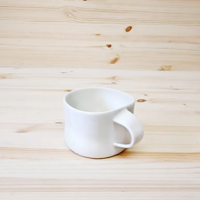 Tonfisk Designs te- och kaffekopp Touch har en charmerande, asymmetrisk och organisk form inspirerad av det finska vinterlandskapet och snödrivorna. Koppen görs i porslin där varje individuell kopp gjuts till en rund form och därefter formpressas till sin ovanliga form för hand. Tack vare tillverkningsprocessen är varje kopp unik – som kollektionens namn antyder har den en mänsklig touch. Koppen tål att diskas i diskmaskin.