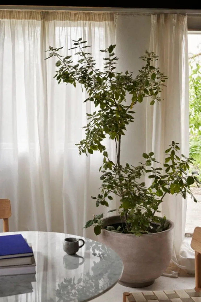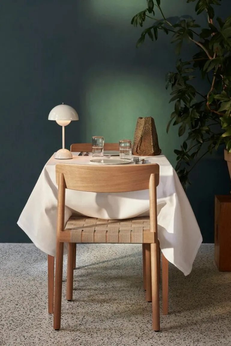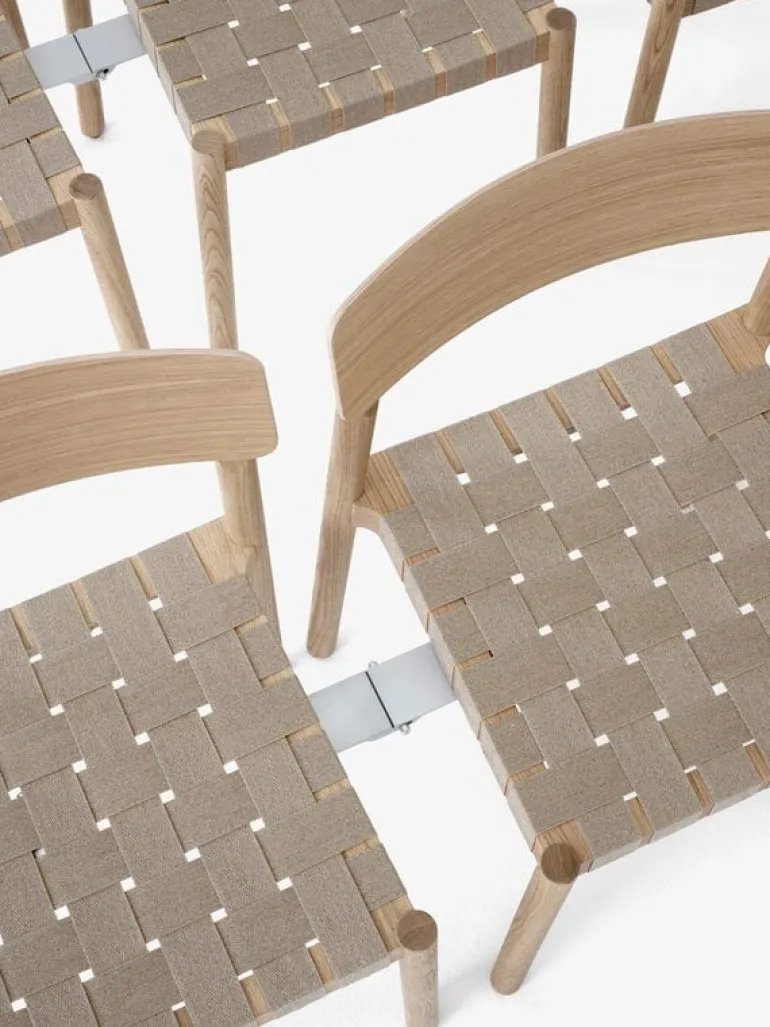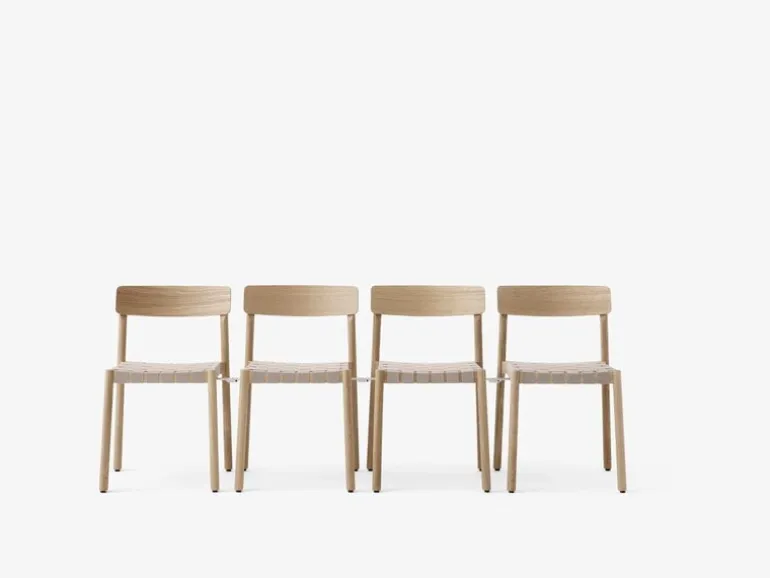 Betty TK1, som designats av Jakob Thau och Sami Kallio för &Tradition, är en stol i massiv ek med sits i linnevävt band. Kombinationen av trä och naturlin ger stolen en organisk känsla, och det flexibla, stödjande bandet är skönt att sitta på. Den stabila, lätta och stapelbara konstruktionen gör Betty till en perfekt matstol, men den passar lika bra som sidostol i alla rum.