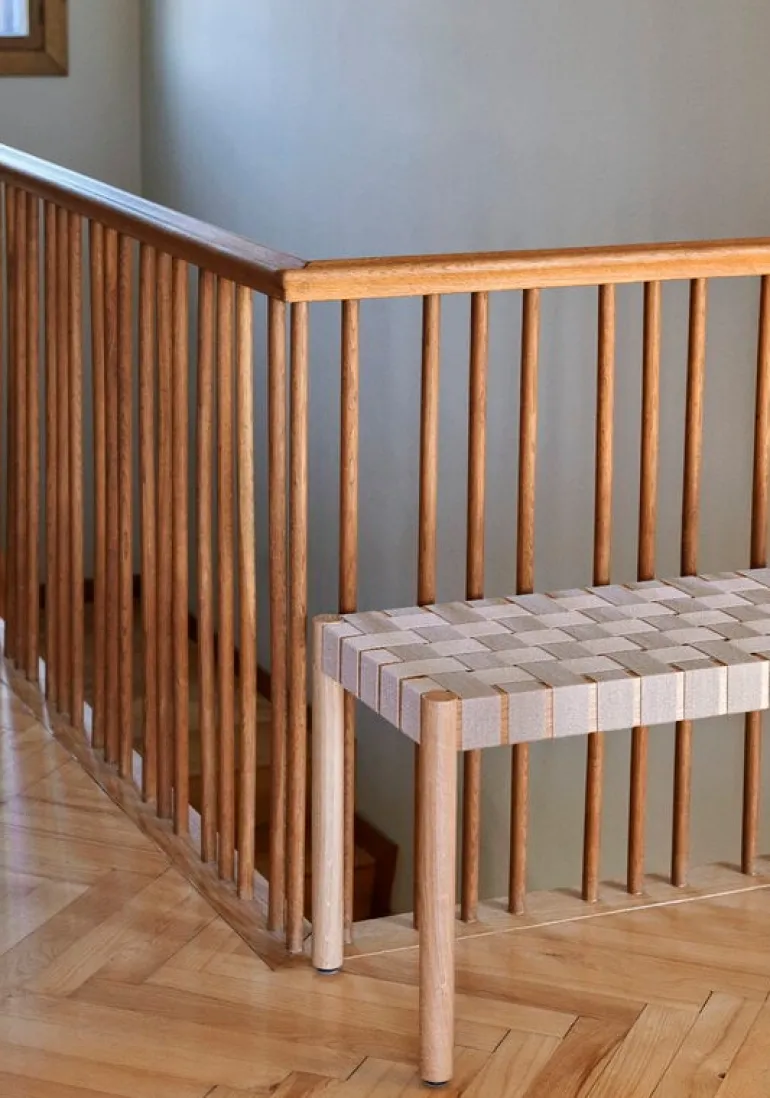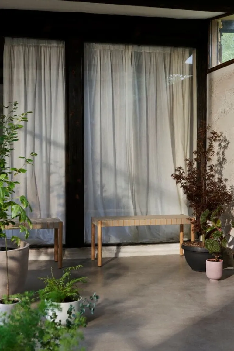 Betty TK4 är en bänk i massivt trä med en sits av sadelgjordsvävt linne, designad av Jakob Thau och Sami Kallio för &Tradition. Kombinationen av träytan och det naturliga linnet ger bänken en organisk känsla, och den flexibla och stöttande sadelgjordsväven är behaglig att sitta på. Den stabila och lättviktiga strukturen gör bänken Betty perfekt för matsalen eller andra rum i hemmet.