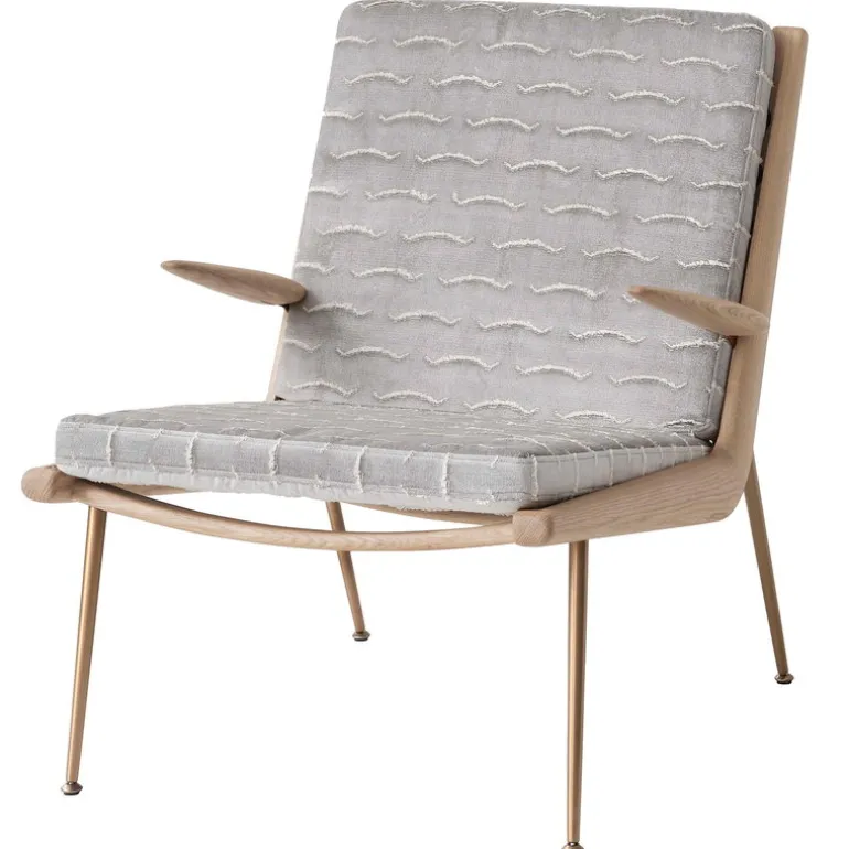 &Traditions Boomerang-fåtölj är ett utmärkt exempel på dansk modernisms minimalistiska estetik. Fåtöljen designades av de gamla mästarna Hvidt & Mølgaard år 1956 och består av mjuka, men eleganta, kuddar och en handpolerad träram som bärs upp av ben i mässing. Den böjda trästången på framsidan är en rolig detalj i den annars simpla designen. Namnet för Boomerang-fåtöljen kommer från formen – när man ser den från sidan ser den L-formade ramen ut som en bumerang.