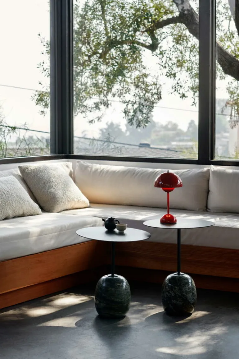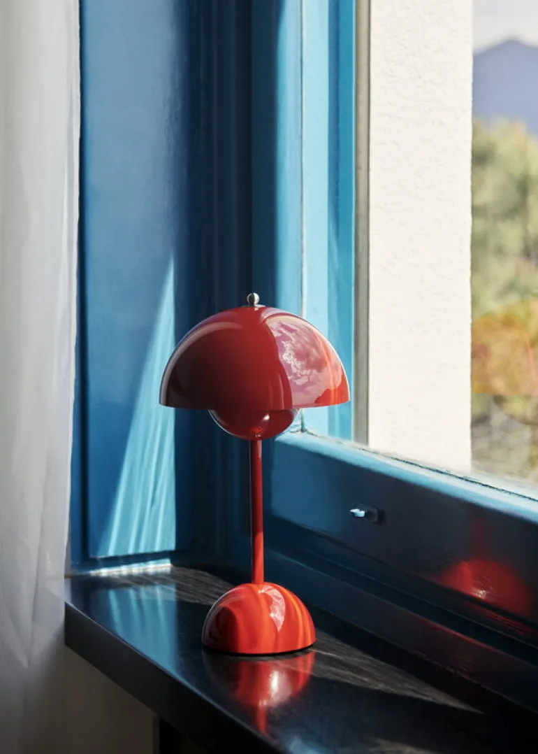 Bärbara Flowerpot VP9, från &Tradition, är en sladdlös version av den ikoniska bordslampan Flowerpot, som designats av Verner Panton. Lampan Flowerpot, som utstrålar både ljus och glädje, har hämtat inspiration från 60-talets era av fred, kärlek och Flower Power – och efter lanseringen kom den snart att bli en riktig designikon. Lampans silhuett utgörs av två halvklot, som låter ljuset reflekteras neråt på ett mjukt och trivsamt sätt.