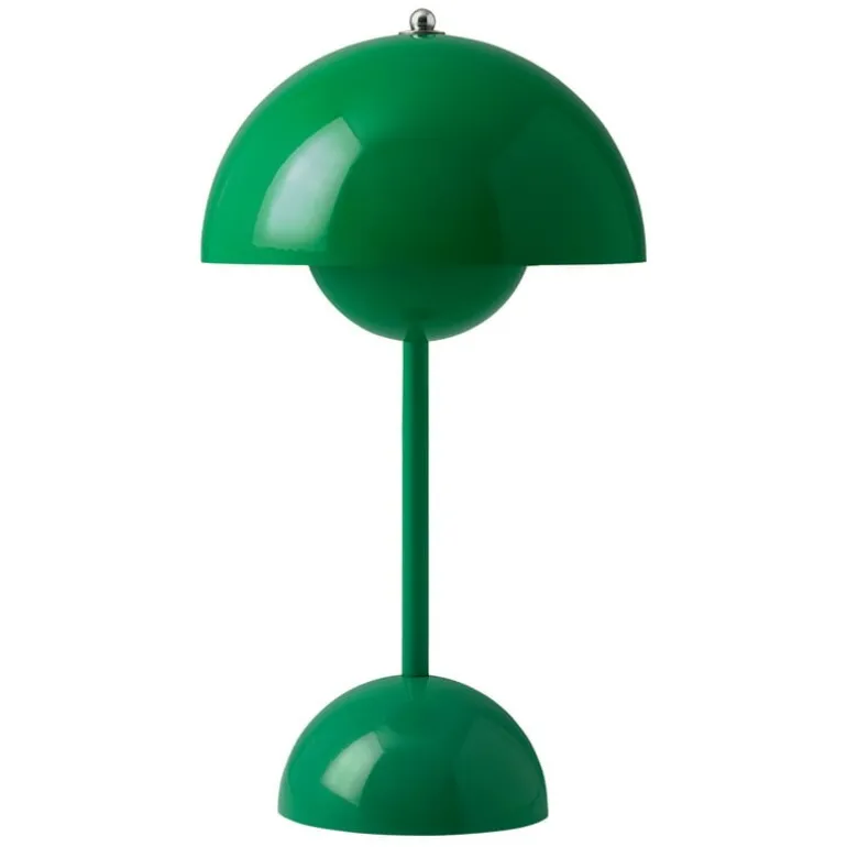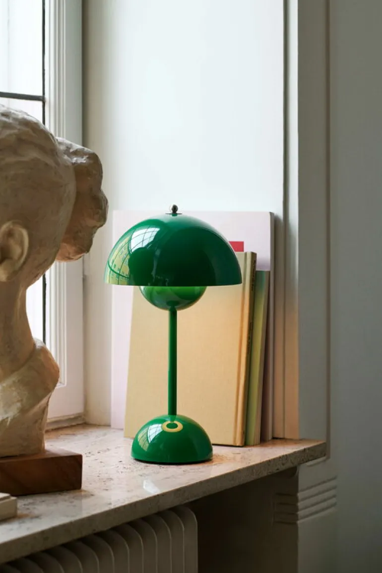 Bärbara Flowerpot VP9, från &Tradition, är en sladdlös version av den ikoniska bordslampan Flowerpot, som designats av Verner Panton. Lampan Flowerpot, som utstrålar både ljus och glädje, har hämtat inspiration från 60-talets era av fred, kärlek och Flower Power – och efter lanseringen kom den snart att bli en riktig designikon. Lampans silhuett utgörs av två halvklot, som låter ljuset reflekteras neråt på ett mjukt och trivsamt sätt.