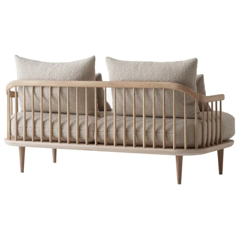 &Traditions 2-sits soffa Fly SC2 representerar bekanta element av traditionell dansk design, men lyckas ändå vara något helt nytt. Fly-soffan, som är designad av Space Copenhagen, är tillverkad av massiv ek och ekfaner, och kuddarna är klädda i ett högkvalitativt ullblandat tyg. De stora, lösa ryggkuddarna kan arrangeras enligt användarens önskemål. Fly-kollektionens lätta utseende och tidlösa känsla gör den väl lämpad för alla moderna interiörer.