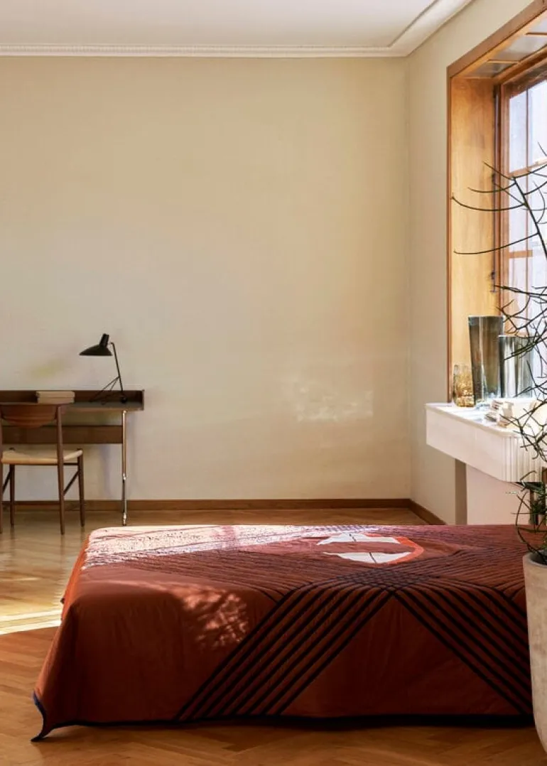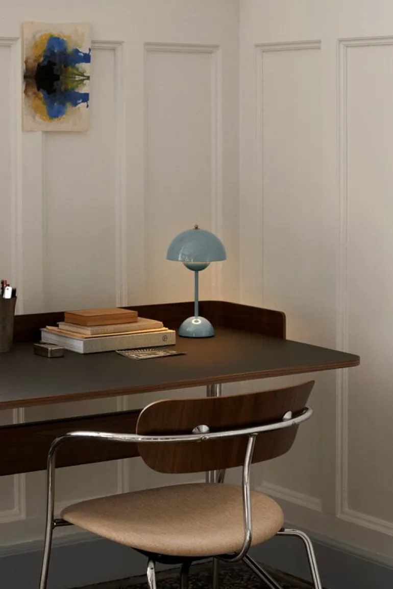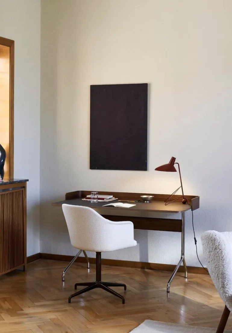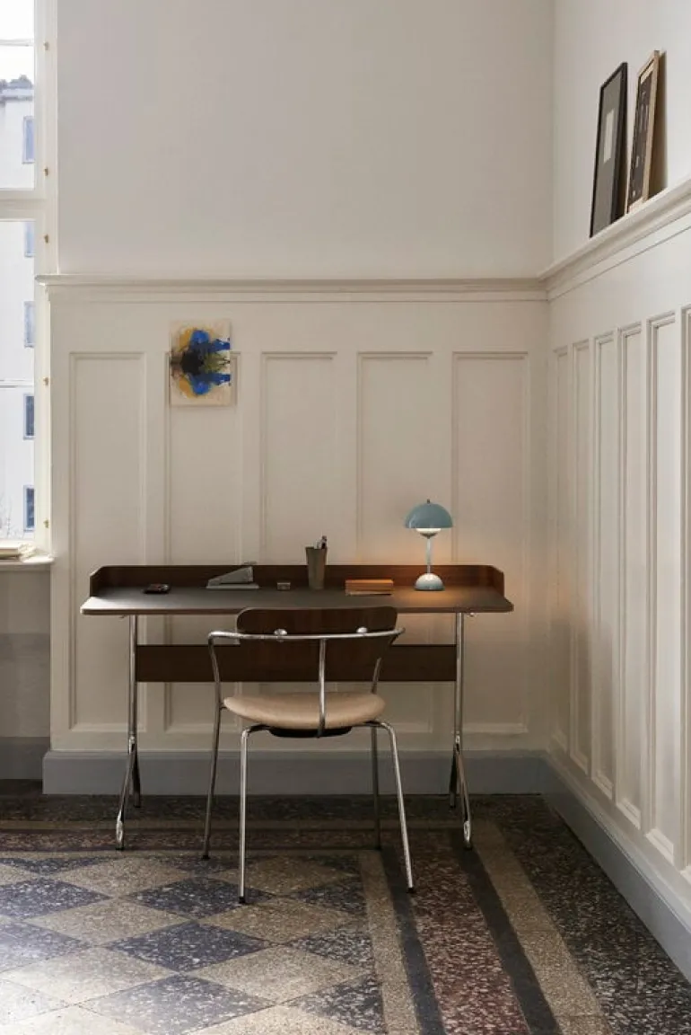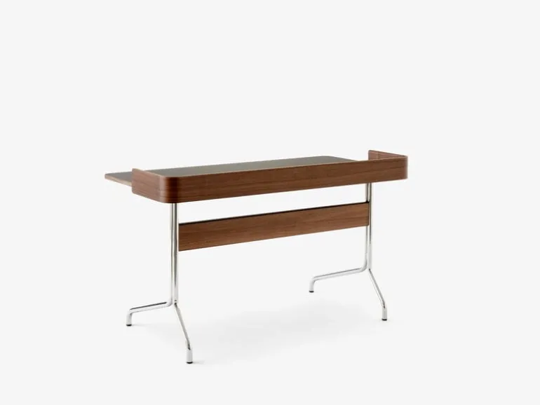 &Traditions Pavilion AV17-skrivbord, formgivet av Anderssen & Voll, har samma eleganta designuttryck som duons Pavilion-stolar. Skrivbordet lanserades 2021 och har en tunn linoleumbelagd skiva som bärs upp av metallben som böjs utåt längst ner.