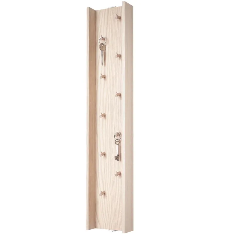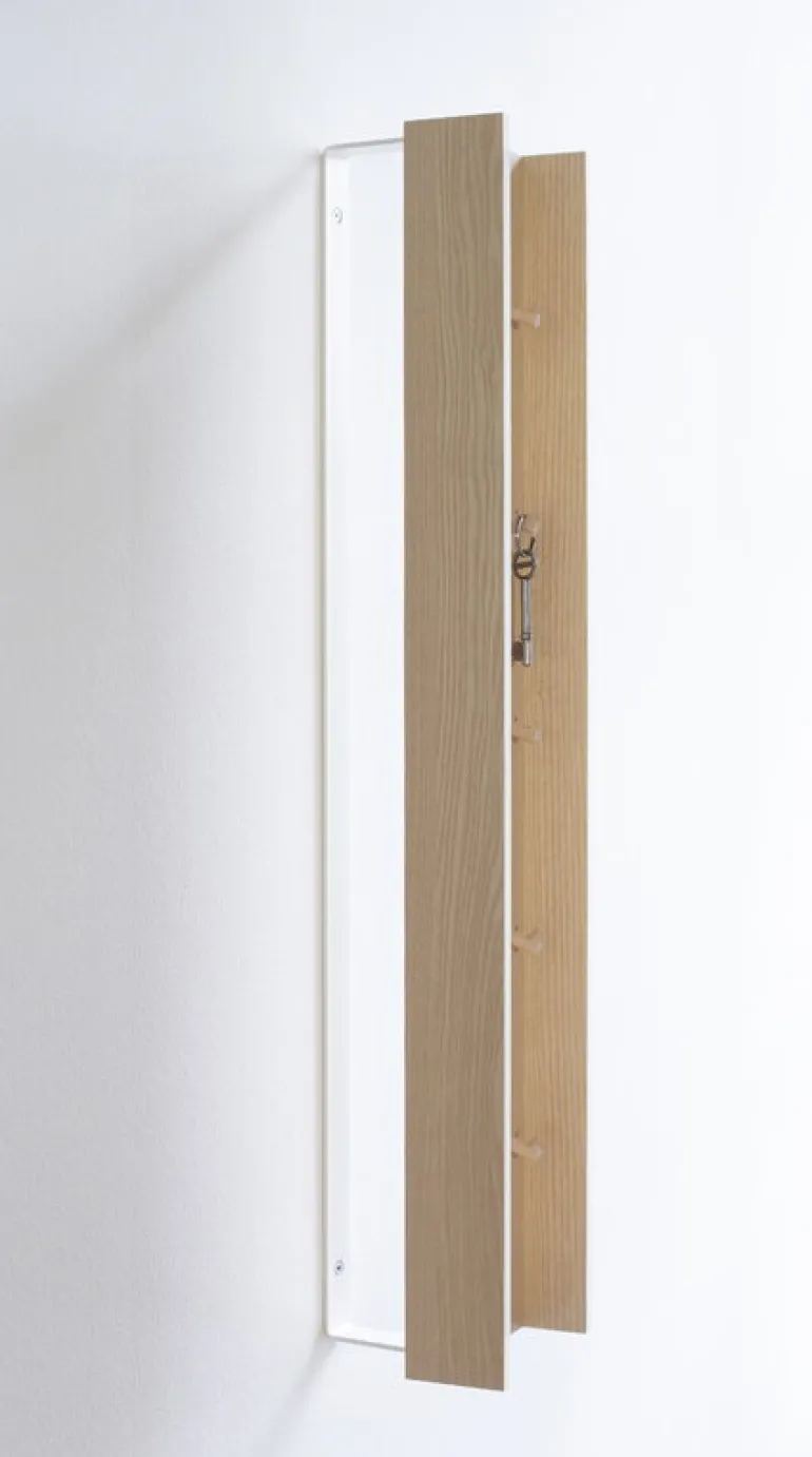 Nyckelskåpet Around, som är designat och tillverkat av Tuulia Penttilä, döljer överraskande detaljer bakom sin minimalistiska lucka. Skåpet kan fästas på väggen med en stålmekanism som gör att skåpet ser ut att sväva. Det öppnas enkelt med ett tryck och har tio nyckelkrokar inspirerade av trädkvistar. Skåpet Around är tillverkat av massiv ask och har unika mönster och nyanser.