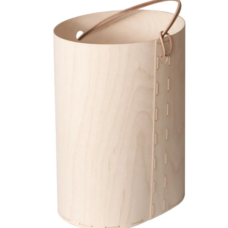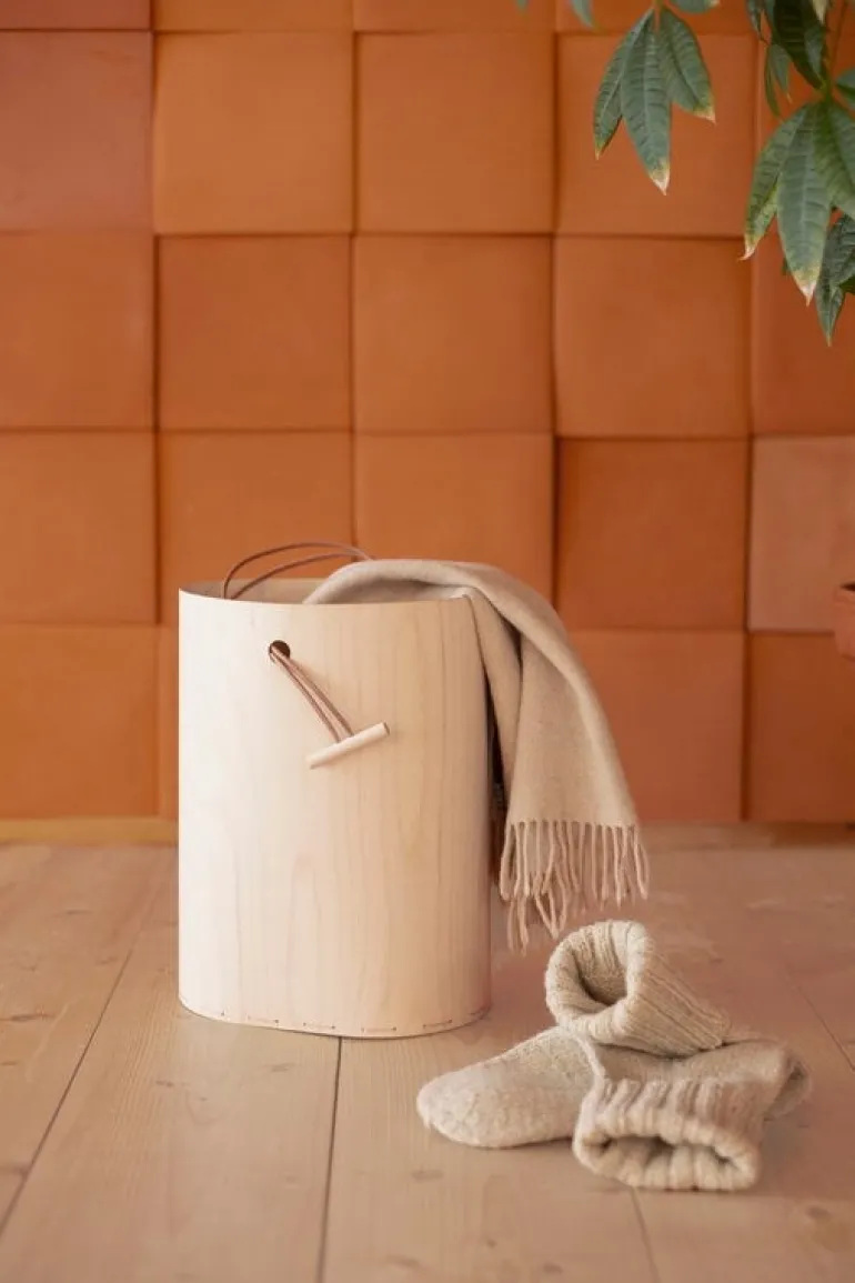 Korgen Round, som är tillverkad och designad av Tuulia Penttilä, är en unik och mångsidig plats för småförvaring. Korgen tillverkas utan lim, med metoden sadelhäftning, och den består av tunn björkplywood med en lekfull läderrem. Designens mjuka former och enkla yttre gör korgen utmärkt för både förvaring och dekoration i hemmet. Den lätta vikten gör även korgen smidig att ta med sig på språng.