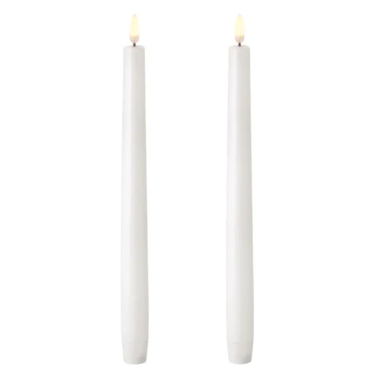 De avsmalnande LED-ljusen från Uyuni Lighting är ett säkert sätt att skapa en varm och inbjudande atmosfär i ditt hem – en sådan som endast det mjukt flimrande ljuset från tända ljus kan skapa. LED-ljusen är övertygande autentiska. De är belagda med äkta stearin och utrustade med Uyunis patenterade 3D-låga som imiterar den fladdrande lågan på ett vanligt ljus, och lyser mjukt med ett varmt och vitt sken.